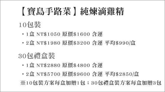 商品訊息簡述: 只要1050元起(含運)即可購得【寶島手路菜】原價最高9600元純煉滴雞精1盒/2盒:(A)10包裝/(B)30包禮盒裝;A方案每盒加贈1包,B方案每盒加贈3包!